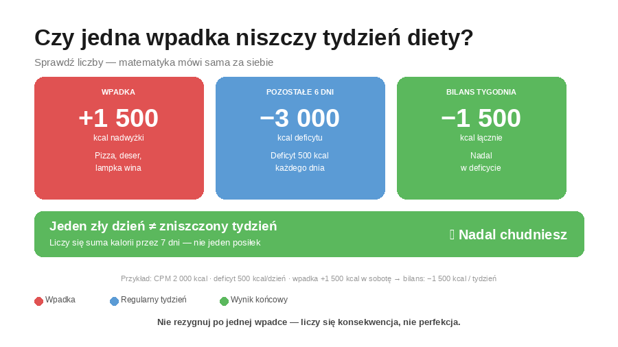 Najważniejsze informacje z tego artykułu Czy jedna wpadka niszczy tydzień diety? Sprawdź liczby Miałeś budżet na ten tydzień. Przez cztery